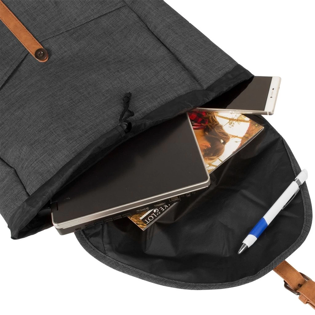 Functionaliteit & Eenvoud komen samen in deze rugtas. Een tas met een minimalistisch karakter, maar ideaal als je op pad gaat met je tablet of laptop. Rechthoekig gevormd met een rond gevormde overslag in een andere kleur. De backpack draagt comfortabel doordat de verstelbare schouderbanden en het rugvlak gewatteerd zijn. Het hoofdvak is afsluitbaar met een trekkoord. De gespsluiting op de overslag sluit met een magneetknoop en heeft een leatherlook die in het ontwerp doorloopt over de lengte van de tas. In het hoofdvak zit een laptopvak (31×26 cm) en een ritsvakje voor kleinere spullen. Het handvat zorgt ervoor dat de tas eenvoudig op te pakken en op te hangen is. Een nette rugtas ideaal voor dagelijks gebruik.