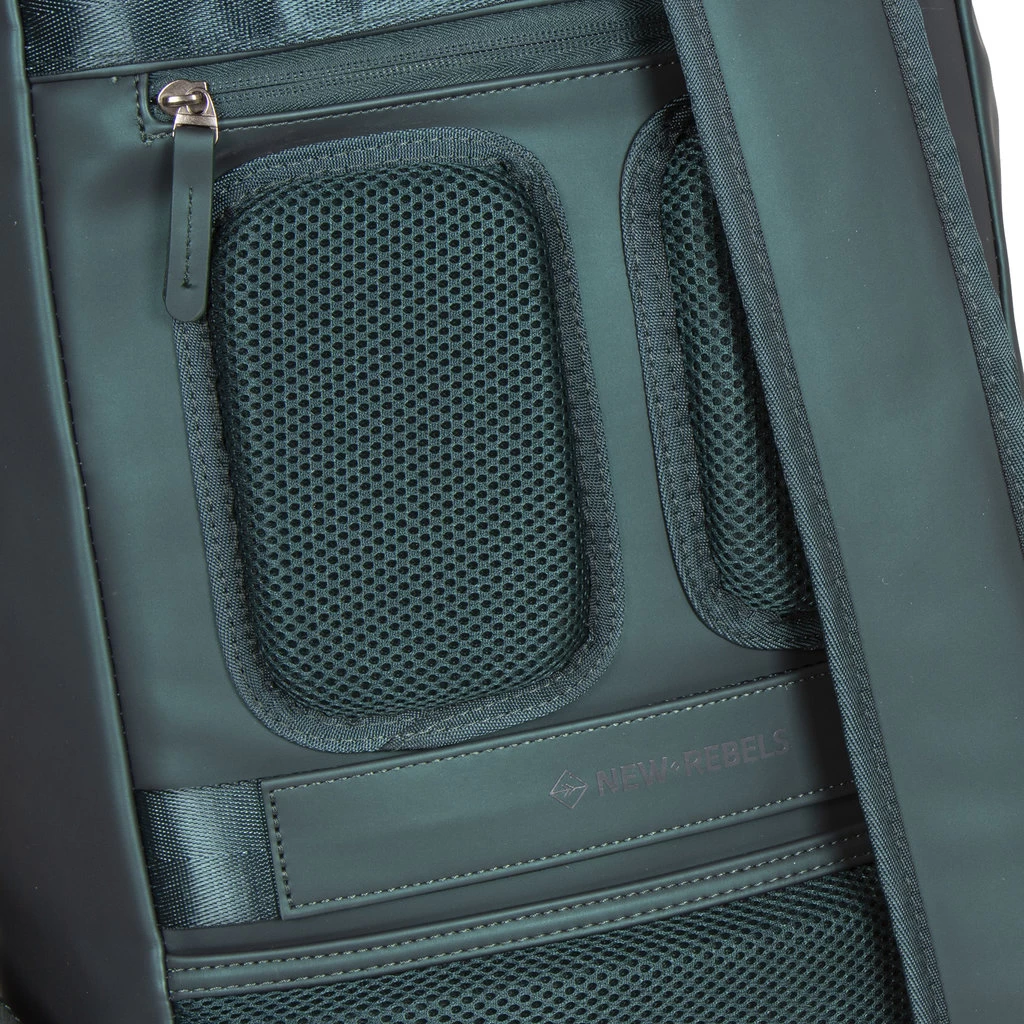 Deze waterafstotende rugzak uit de Harper serie van New Rebels. De tas is gemaakt van waterproof PU materiaal wat de tas waterbestendig maakt ook ideaal voor de wintersport of als laptoprugzak voor op de fiets. De rugzak beschikt over een ruim hoofdvak die afsluitbaar is met een waterkerende ritssluiting. In het hoofdvak met ritssluiting zit een ritsvak, een telefoonvak, een insteekvak en een laptopvak voor een 15,6″ laptop. Op de voorzijde van de tas zitten een horizontaal ritsvak en een verticaal ritsvak. In het horizontale ritsvak bevinden zich twee insteekvakken, twee pennenvakken en een ritsvak. De tas beschikt over 2 verstelbare rugbanden, hierdoor kan u de tas altijd op de gewenste lengte dragen. Het rugpaneel en de schouderbanden zijn gewatteerd, hierdoor draagt je de tas zeer comfortabel. Kofferriem om op een koffer/trolley handvat te plaatsen.