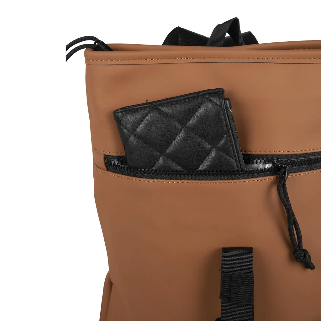 Deze trendy waterafstotende rugtas draagt comfortabel door het lichtgewicht en de gewatteerde schouderbanden. Toch behoudt deze rugzak zijn charme door de fijne vormgeving. Het hoofdvak is eenvoudig te vergroten of verkleinen door het oprol gedeelte aan de bovenkant. Hierdoor kun je tot 10 cm meer ruimte creëren. Het hoofdvak is afsluitbaar met een stevige rits en een gespsluiting die als een zwarte strook doorloopt in het design. In het zilverkleurige hoofdvak zitten twee insteekvakjes en een ritsvakje voor bijvoorbeeld je telefoon. Op de voorkant en achterkant van de rugzak zit ook een extra ritsvak, handig voor kleine spullen waar je snel bij moet kunnen. Het stevige handvat zorgt ervoor dat de tas eenvoudig op te pakken en op te hangen is.